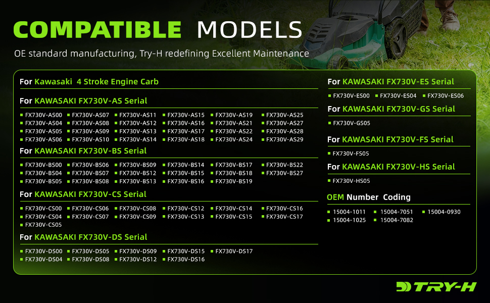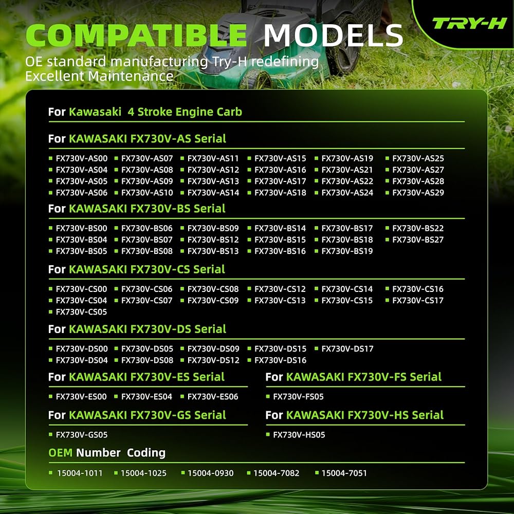Compatibility: This carburetor is compatible with Kawasaki 4 Stroke Engine Carb, FX730V-AS Serial, FX730V-BS Serial, FX730V-CS Serial, FX730V-DS Serial, FX730V-ES Serial, FX730V-FS Serial, FX730V-GS Serial, FX730V-HS Serial, matching their fuel-air mixture requirements.