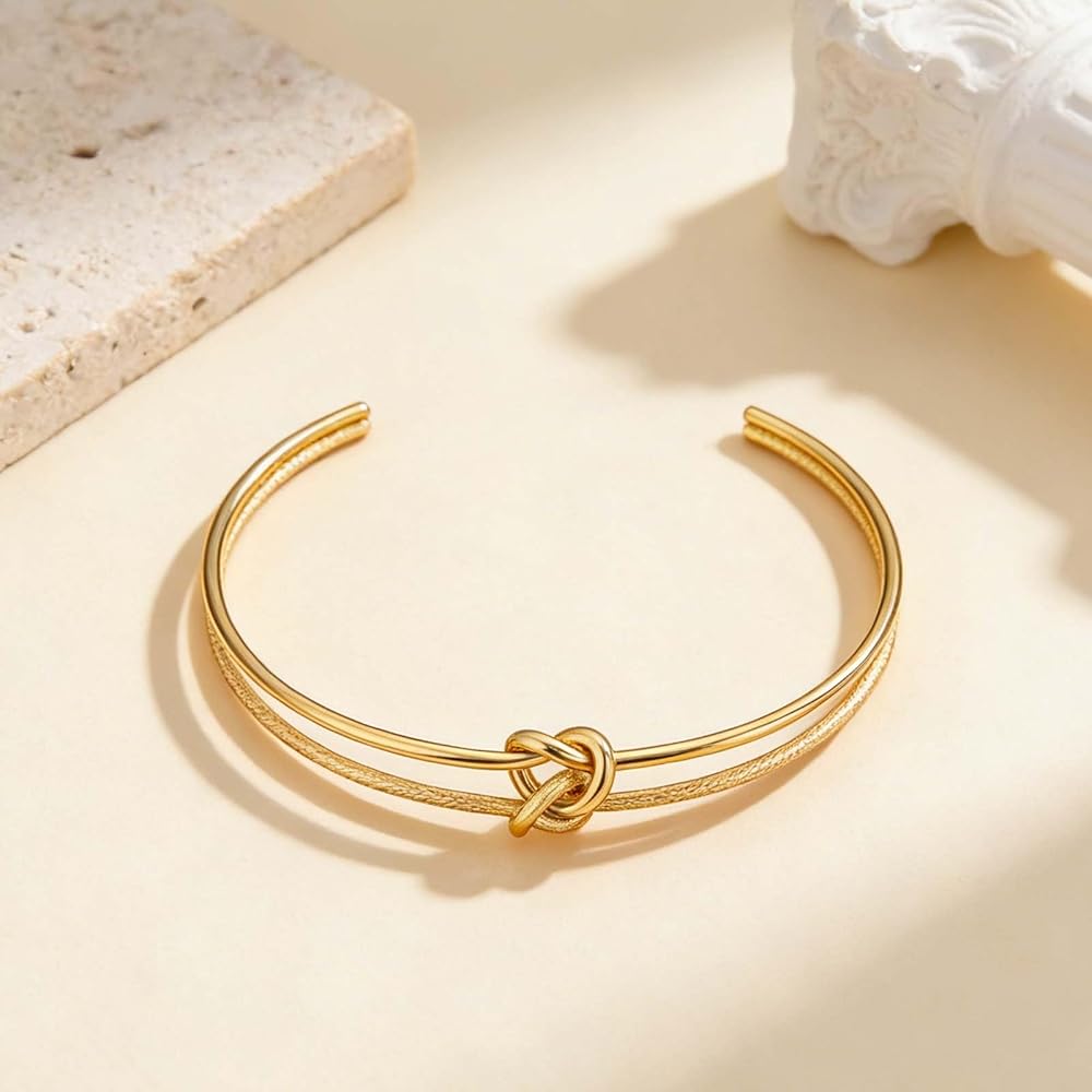 This adjustable knot bangle bracelet features a refined two-tone design with a symbolic love knot centerpiece. The clean lines and balanced shape create a versatile accessory that complements both casual and elegant looks. With an open, adjustable structure, the bracelet is easy to wear and comfortable throughout the day. Its minimalist style makes it suitable for stacking or wearing alone as a subtle statement piece. Perfect for daily styling or as a thoughtful jewelry choice for meaningful occasions, this knot bracelet adds a touch of elegance to any wrist collection.