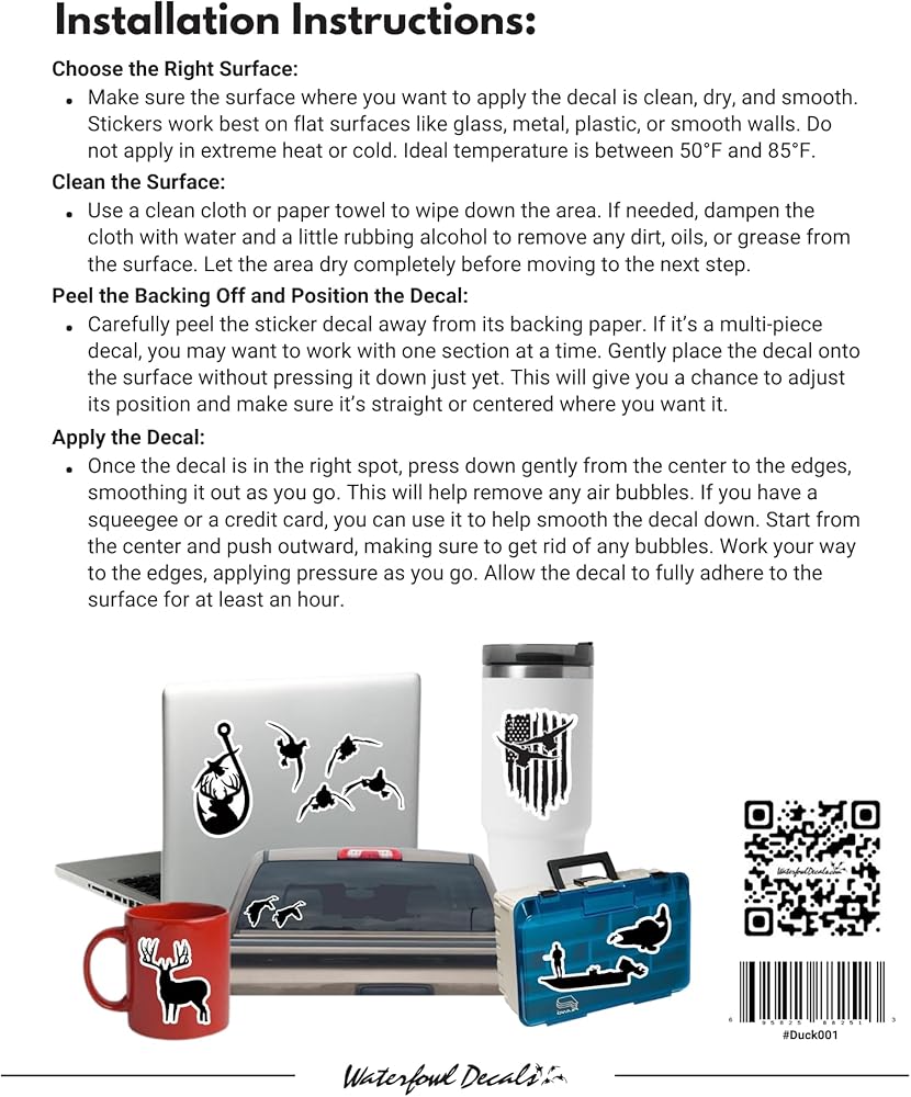 Applying our Ultimate Duck Decals is a breeze! No hassle with transfer tape—just peel and stick. Each decal is a single, solid piece, precisely contour cut to match the artwork's curves. For best results, simply clean and dry the application area, then position the decal where you want it. Press from the center out to the edges to ensure a smooth, secure application.