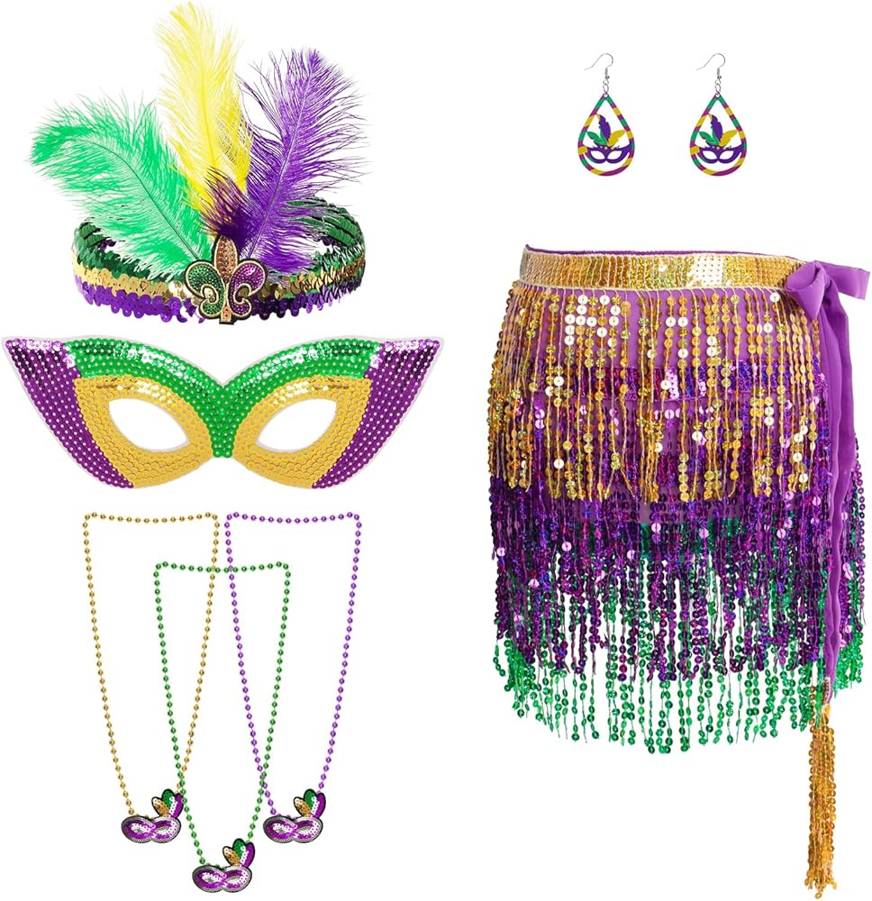 7PCS Mardi Gras Outfit Accessories Set for Women Sequin Fringe Wrap Skirt faux Feather Headband Masquerade Mask Beads Necklace Earrings Carnival Costume Outfit for Parades Party Dance Festivals