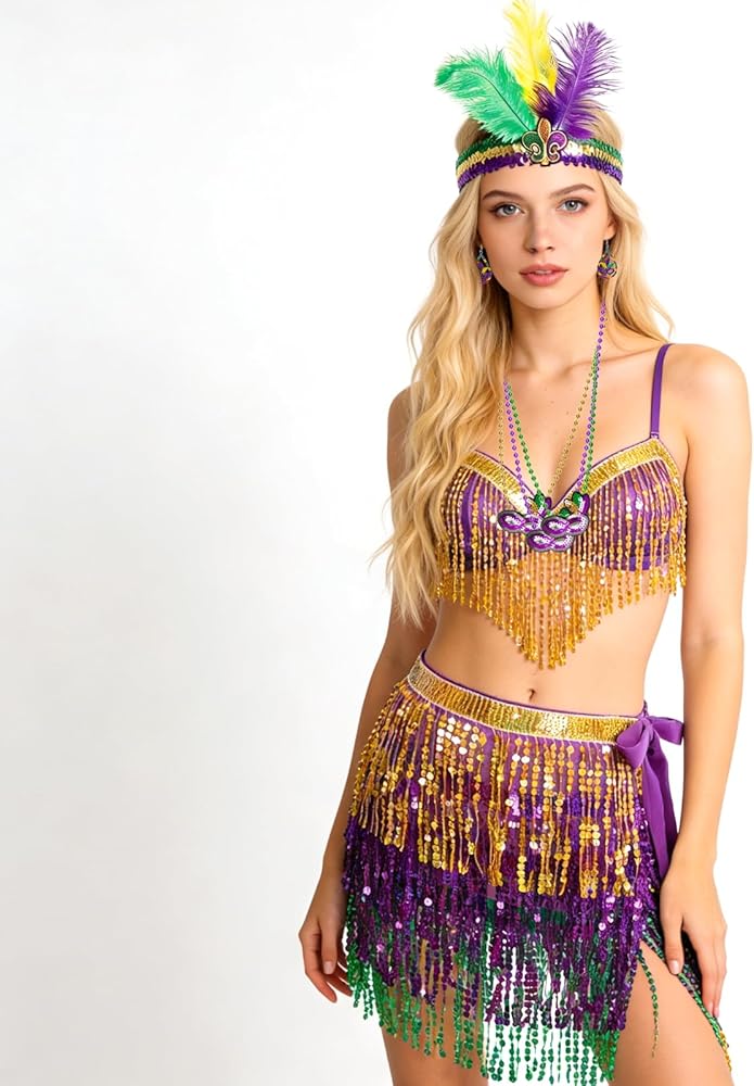• Mardi Gras Outfit Set for Women with Festival Costume Appeal: This mardi gras accessories set delivers a complete 7-piece carnival costume including a sequin fringe skirt, faux feather headband, masquerade mask, themed earrings, and bead necklaces, creating a vibrant look perfect for parades, street parties, photo ops, and weekend celebrations