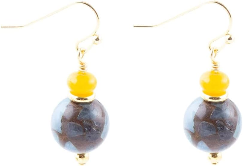Fall in love with these elegant Prairie Quartz and Jade Drop Earrings crafted with genuine natural stones and yellow jade. Their eye-catching colors of blue and yellow are complemented by gold-plated brass metal and hang 1.4" from ear wires. Unique and light, each earring weighs just 0.1 oz and is 0.45" at its widest point, making them a perfect addition to any outfit! Natural variances are part of the beauty of our genuine stones. Your piece will vary slightly from the image shown.