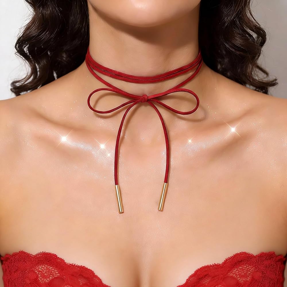2 PCS Gothic-Bowknot Velvets Red Chokers Necklace Set for Women- Sexys Long Wrap Chokers Necklace with Gold Tube Pendant, Long Wrap Rope Collar Tie Neck Chain Party Neck Accessories