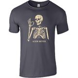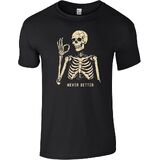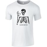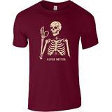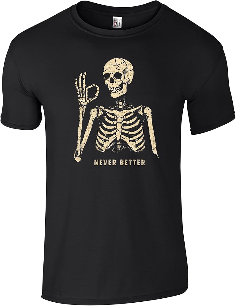 How are you doing? Never Better! Printed with soft hand inks on soft ring spun combed cotton or cotton/spandex blend Tee. Long lasting design will not crack or peel even after many washes.