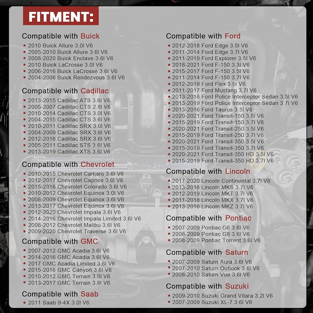 Vehicle Fitment-2:OEM Spark plugs for Chevrolet Chevy Impala 3.6 12-20,Impala Limited 3.6L 14-16,Equinox 3.6L 08-17,Malibu 3.6 08-12,Colorado 3.6L 15-16,Camaro 3.6L 10-15,Caprice 3.6L 12-17,Traverse 3.6L 09-20; for GMC Terrain Acadia 3.6 13-17,Terrain 3.0L 10-12,Acadia 3.6L 07-12,Canyon 3.6L 15-16; for Lincoln MKS 3.7L 13-16,MKT 3.7L 12-19,MKX 3.7L 11-18,MKZ 3.7L 13-16; for Pontiac G6 G8 3.6L 07-09,Torrent 3.6L 08-09; for Saturn Aura Outlook 3.6L 07-10,Vue 3.6L 08-10 and more
