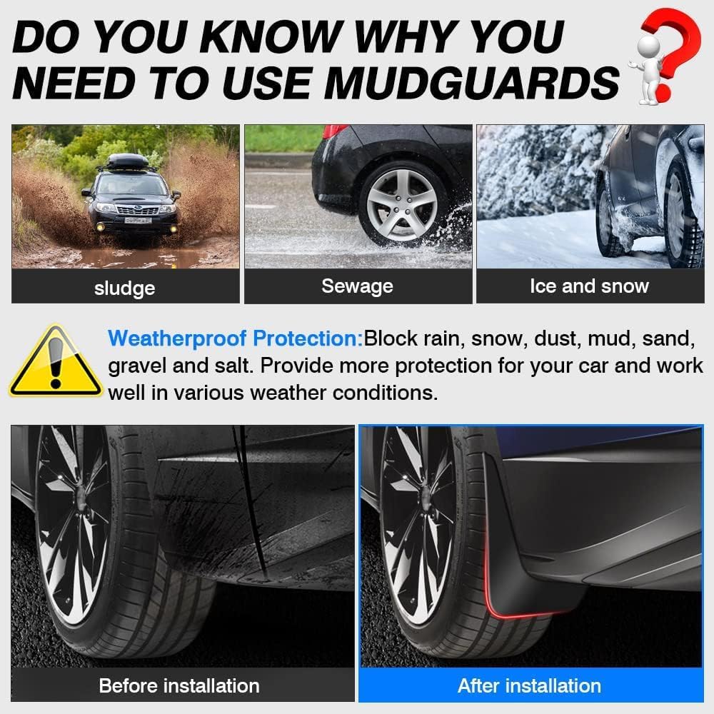 Made of high-quality ABS materials, sturdy and durable. The mud flaps can block rain, snow, dust, mud, sand, gravel and salt, providing more protection for your car, and can work normally in all weather conditions.
