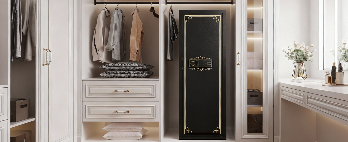 Easy Installation:This gun safe features a sleek black finish with elegant gold accents, blending seamlessly with various home decors. It also comes with pre-drilled holes and mounting hardware for easy installation in your home, garage, or office