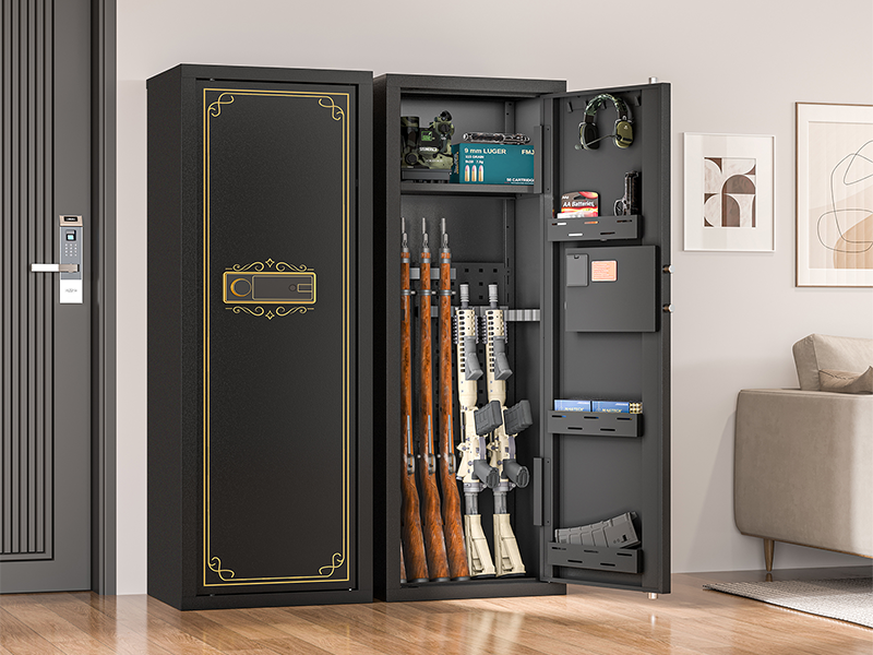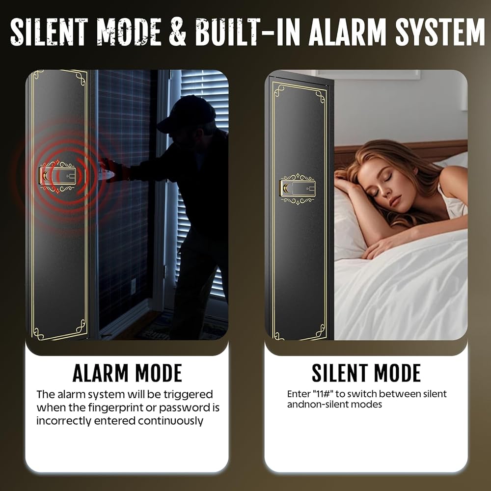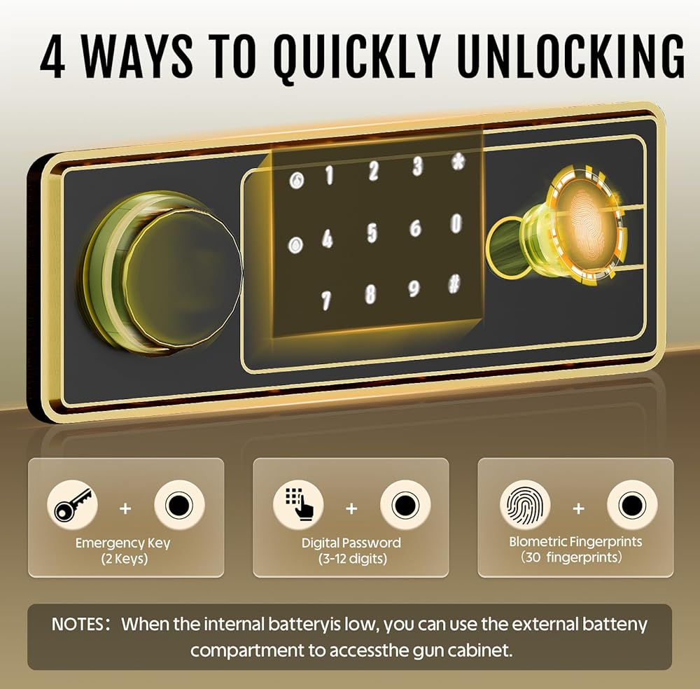 Quick Access Biometric Gun Safe: This gun safe for rifles equipped with advanced biometric fingerprint technology, this rifle safe for home allows you to access your gun cabinet in <1 seconds while keeping them secure from unauthorized use. As a reliable gun locker, its durable lock mechanism ensures reliability and peace of mind, highlighting why this biometric gun safe is a top choice for home security.