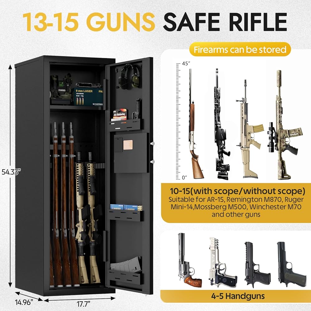 Spacious and Versatile Interior:The kaer gun safe with dimensions of 14.96"D x 17.7"W x 54.33"H,this gun cabinet offers ample space to store multiple rifles,Handgun,and accessories.As a practical gun safe for rifles and pistols, it features removable gun racks that accommodate different gun sizes(Suitable for AR-15 and other guns) and adjustable shelves to storage for scopes, ammo,and other items,making this safe highly adaptable to various storage needs.