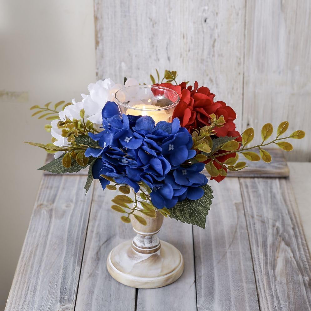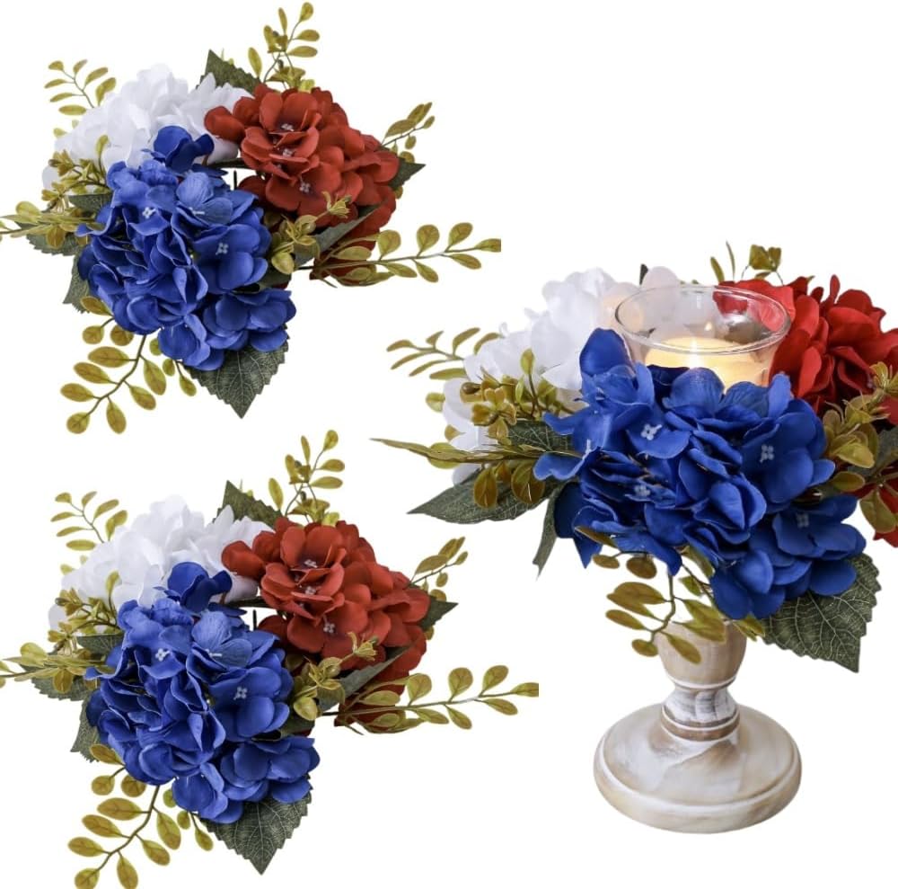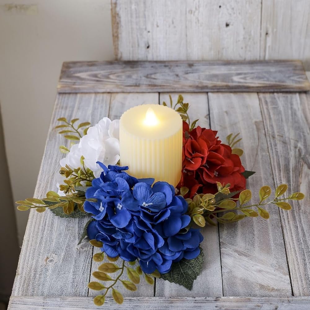 Package Include: You will get 2 pcs Patriotic Candle Rings Wreaths ,Each small wreath comes with full artificial Hydrangea for a warm and welcoming look. These candle rings are a perfect addition to your decorations with their red, white, and blue colors, adding a patriotic touch to any setting.