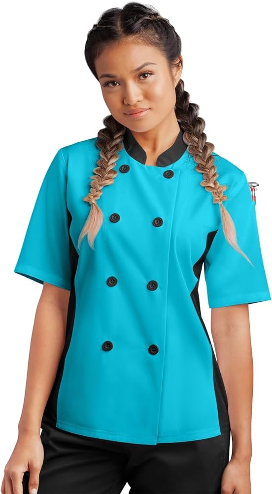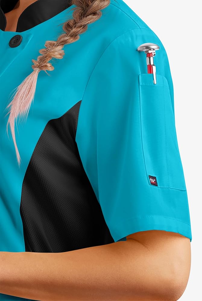 CLASSIC FIT: This chef coat is women styled and fitted for durability and comfort ensuring this coat works as hard as you do without the hassle. This coat features short sleeves, mesh side panels for an added secure and comfortable fit, durable plastic buttons for simplicity, a thermometer sleeve pocket, and a classic fit with executive 2-piece back and a center back vent that creates a look that doesn?t get any more professional than this chef coat.