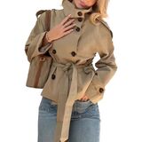 The cropped trench design offers a fresh twist on a classic outerwear piece, making it ideal for layering over dresses, blouses, or sweaters. Its versatile neutral tones complement any outfit, while the structured tailoring guarantees a flattering fit for all body types. The elegant coat features functional buttons and secure pockets, combining practicality with chic aesthetics.