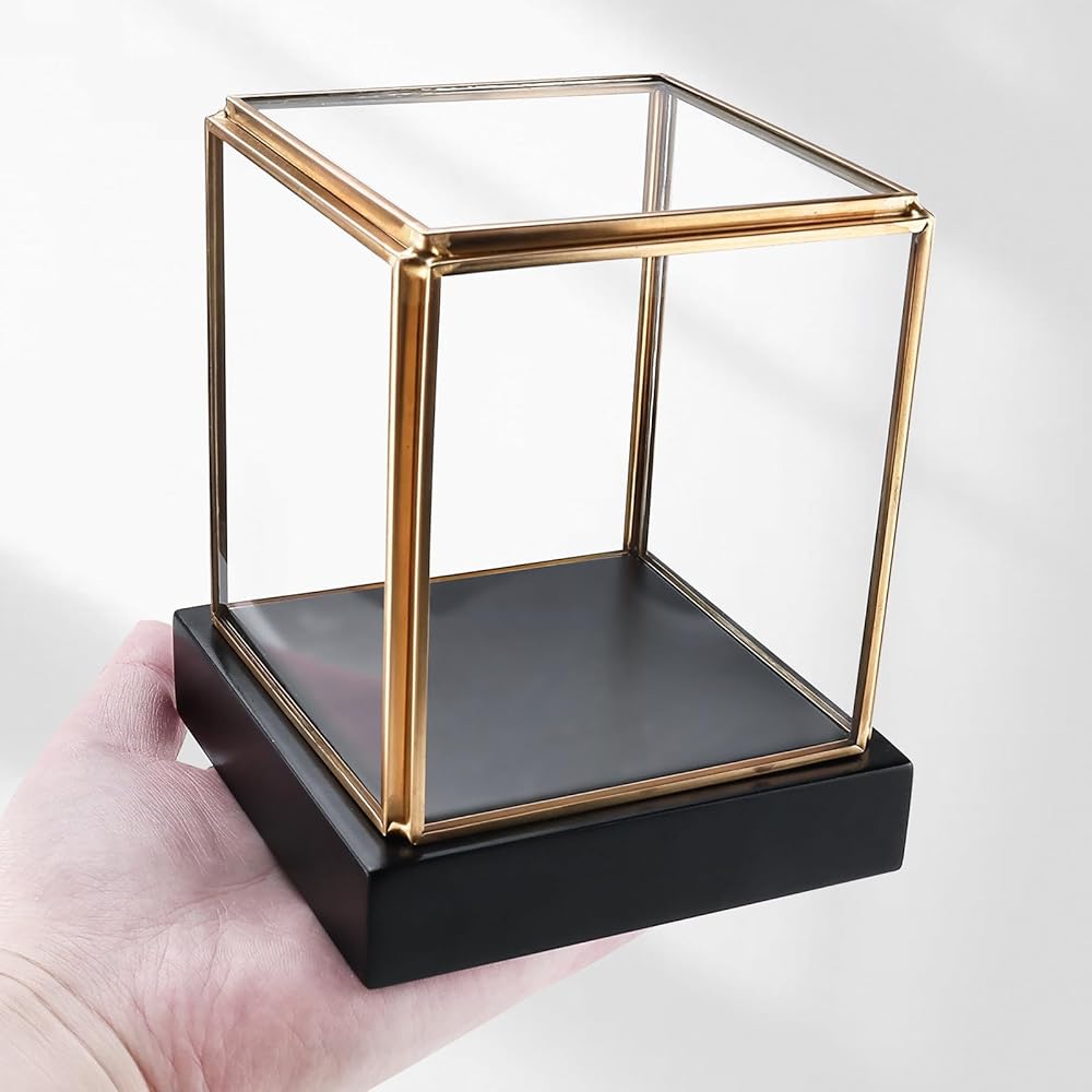 The golden glass display case consists of two parts: a vintage black wooden base (Dimensions: 4"L x 4"W x 0.9"H) and a square transparent glass box with a gold rim (Dimensions: 3.6"L x 3.6"W x 3.9"H). Other accessories are not included.