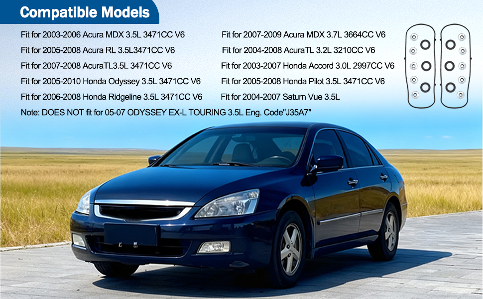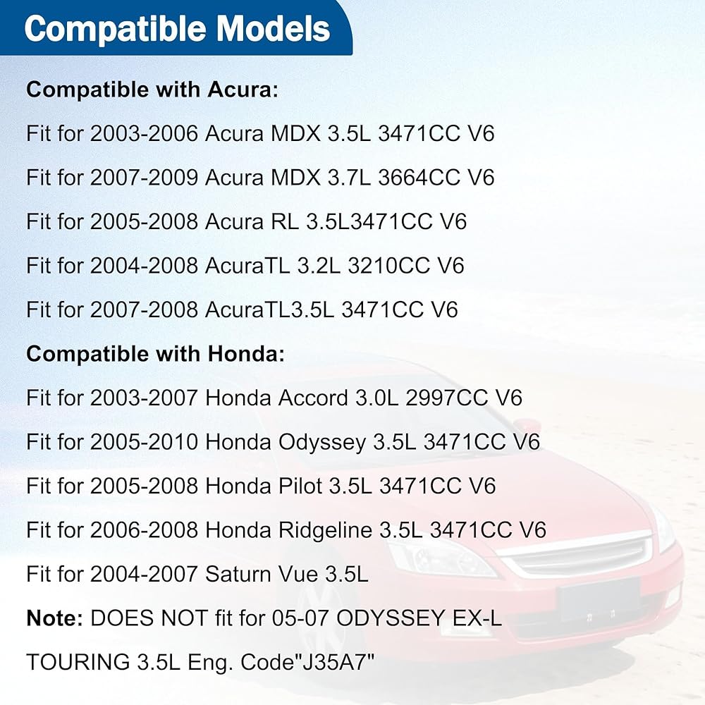 【Fitment】Fit for 2003-2007 Accord Coupe EX EX-L LX SE Special Edition 3.0 Fit for 2005-2010 Odyssey DX EX EX-L LX NHL SE Touring 3.5 Fit for 2005-2008 Pilot EX EX-L LX SE-L Special Edition Value Package 3.5 Fit for 2006-2008 Ridgeline EX-L LX RT RTL RTS RTX 3.5 Fit for 2003-2006 MDX Base Touring 3.5 Fit for 2007-2009 MDX Base 3.7Fit for 2005-2008 RL Base Elite 3.5 Fit for 2004-2008 TL Base 3.2 Fit for 2007-2008 TL Type-S 3.5 Fit for 2004-2007 Vue Base Red Line 3.5
