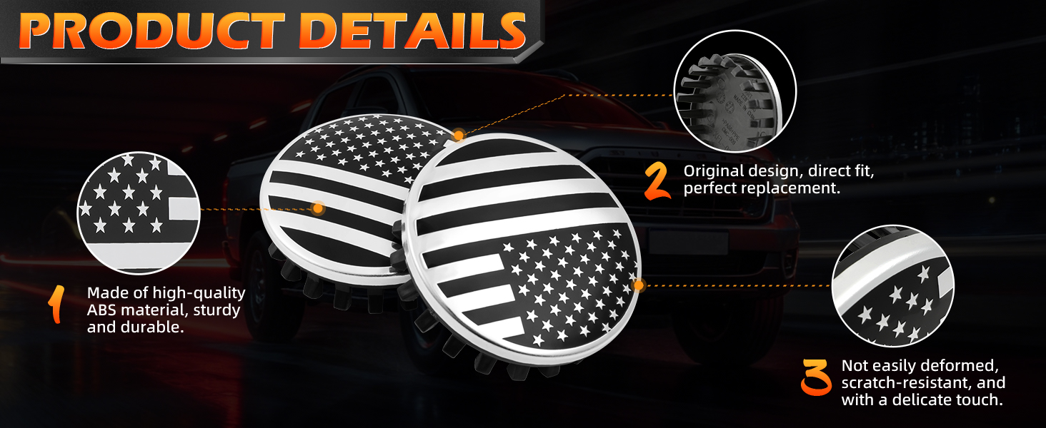 【Decoration】This wheel center cap features a striking metallic finish, enhancing the wheel's aesthetics. Its design perfectly matches your vehicle, significantly improving its appearance and delivering a superior visual effect. Our wheel center cap sticker features a unique American flag design, 3D sculpted and polished to make the flag pattern vibrant and lifelike, instantly making your car stand out. If you are a patriot, this wheel center cap sticker will showcase your love and respect for your country, allowing others to feel your patriotism.