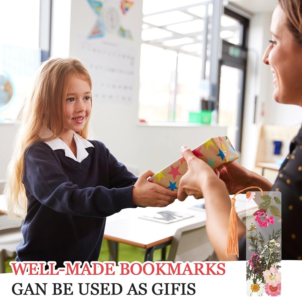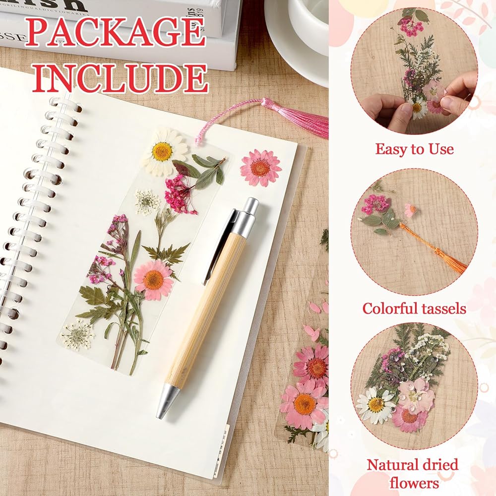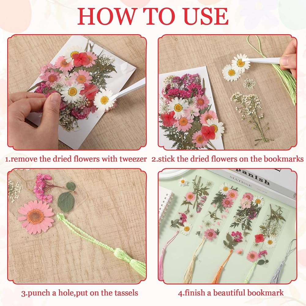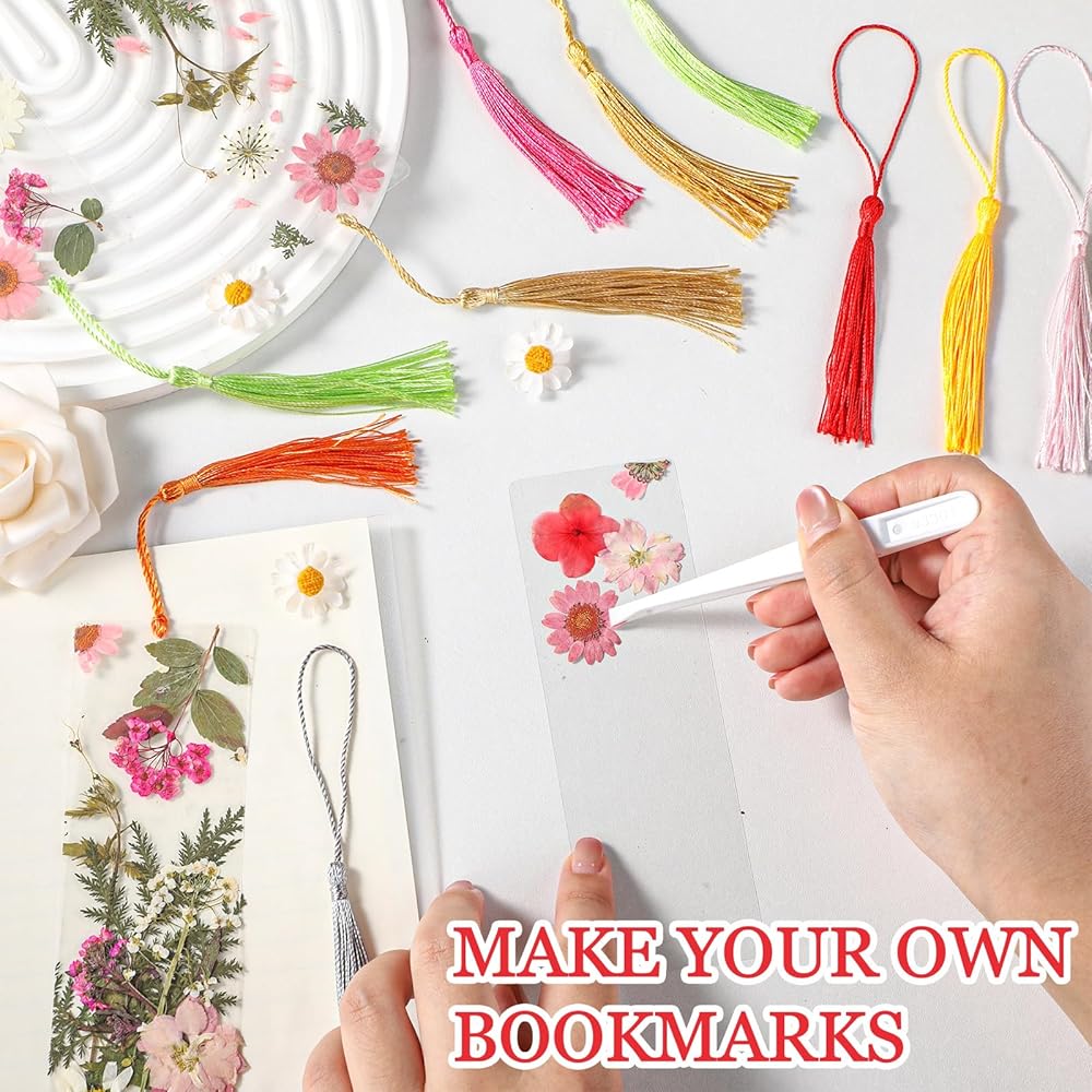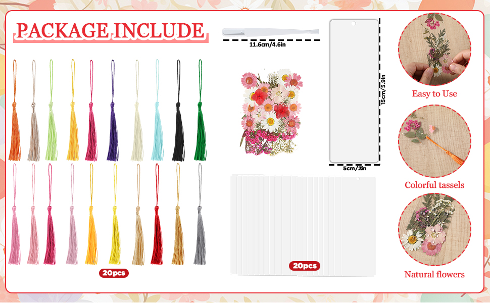 Creating your own bookmarks: This dried flower bookmark making kit add a personal touch to your reading experience includes 20 transparent bookmarks sticker, 20 mix-colors tassels, 1 pack of dried flowers, and 1 tweezer, ideal for infusing creativity into your reading habit or making heartfelt DIY gifts. Warm Tips: You need to punch a hole in the bookmark by yourself.