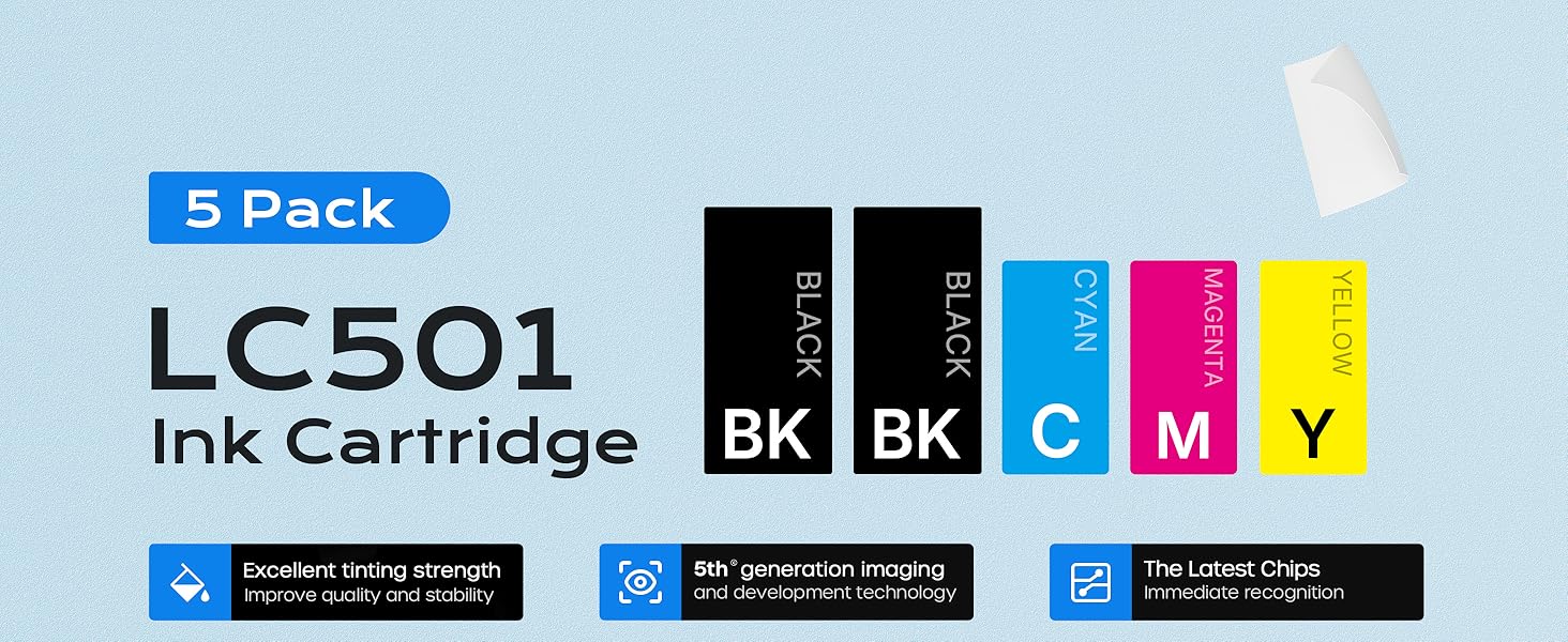 Package Content: 2 x Black LC501BK Ink Cartridge, 1 x Cyan LC501C Ink Cartridge, 1 x Magenta LC501M Ink Cartridge, 1 x Yellow LC501Y Ink Cartridge, 1 x User Guide (Total 5 Pack)