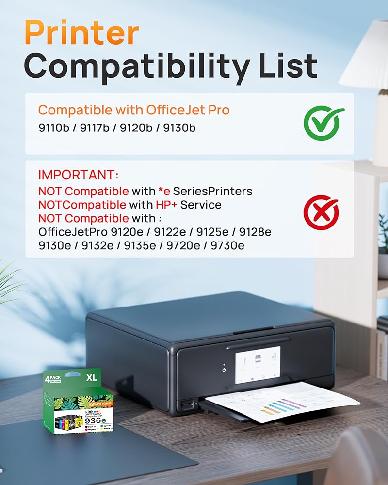 Compatible Printers Note: 936e ink cartridges for hp *e series printers which Never enrolled and paid for HP+ (HP instant ink) services such as OfficeJet Pro 9110b 9117b 9120b 9120e 9125e 9128e 9130b 9132e 9135e 9122e 9730e