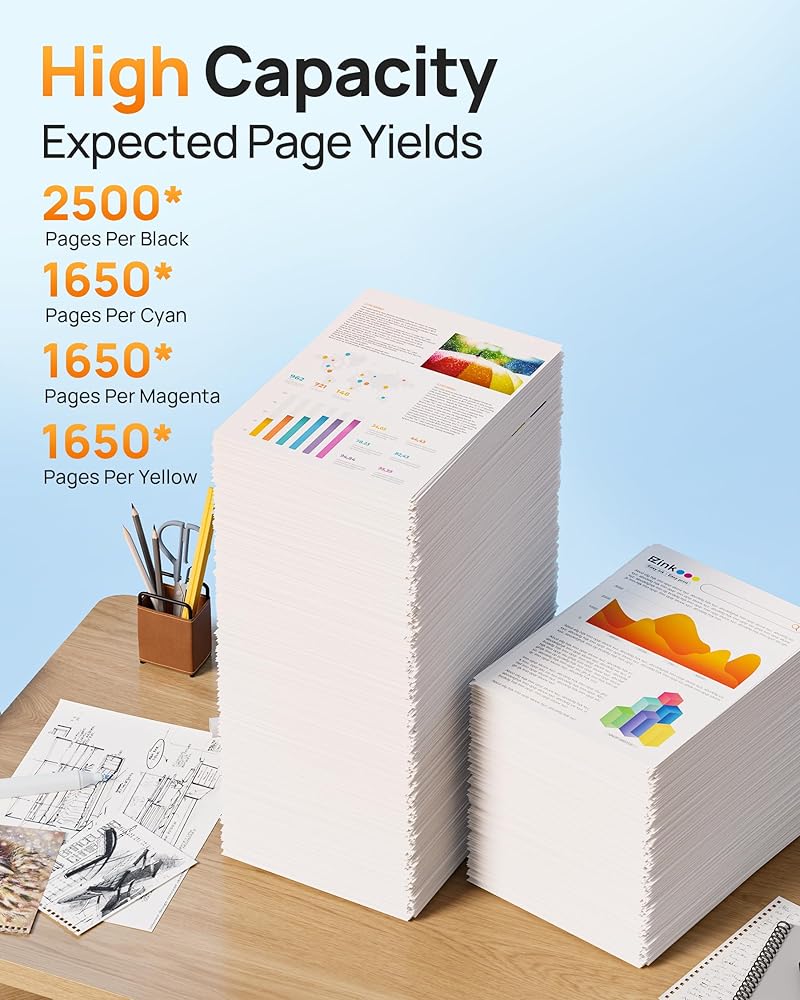 High Page Yield for HP 9120e printer ink cartridges: 936e ink cartridges for HP printers has up to 2,500 pages for HP 936 black ink cartridge and 1,650 pages for each 936xl color ink cartridges(cyan, magenta, yellow) at 5% coverage for A4 paper.