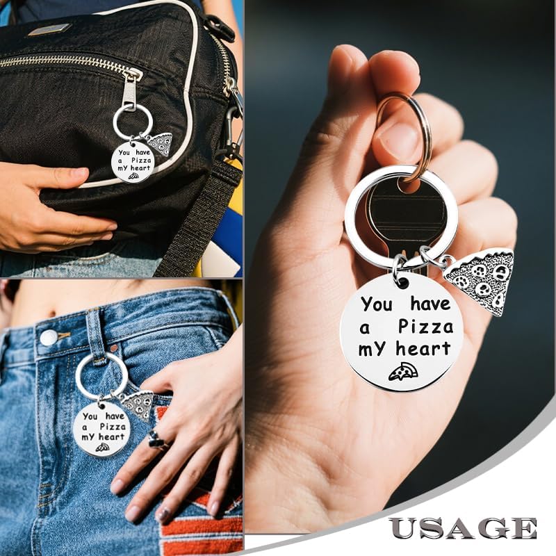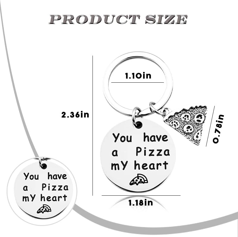 Pizza Keychain for Anniversary Proposal Gifts: This pizza heart keychain features a homophonic slogan of you have a pizza my heart and a pizza pendant, using pizza instead of piece to convey romantic fun emotions, can use as engagement gifts for pizza lovers women men, and it is the core choice of foodie gift for pizza lovers, carrying it daily not only showcases food hobbies, but also conveys warm feelings