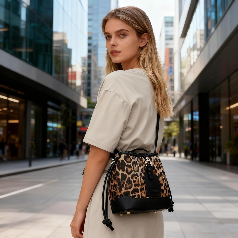 Suitable For Every Occasion: Women's bucket bag leather is lightweight and fashionable, classic style, women's bucket bag with leopard print design, simple, generous and trendy, can be matched with a variety of clothes, suitable for concerts, theme parks, parties, shopping, gym, travel, work, dating, parties and other occasions