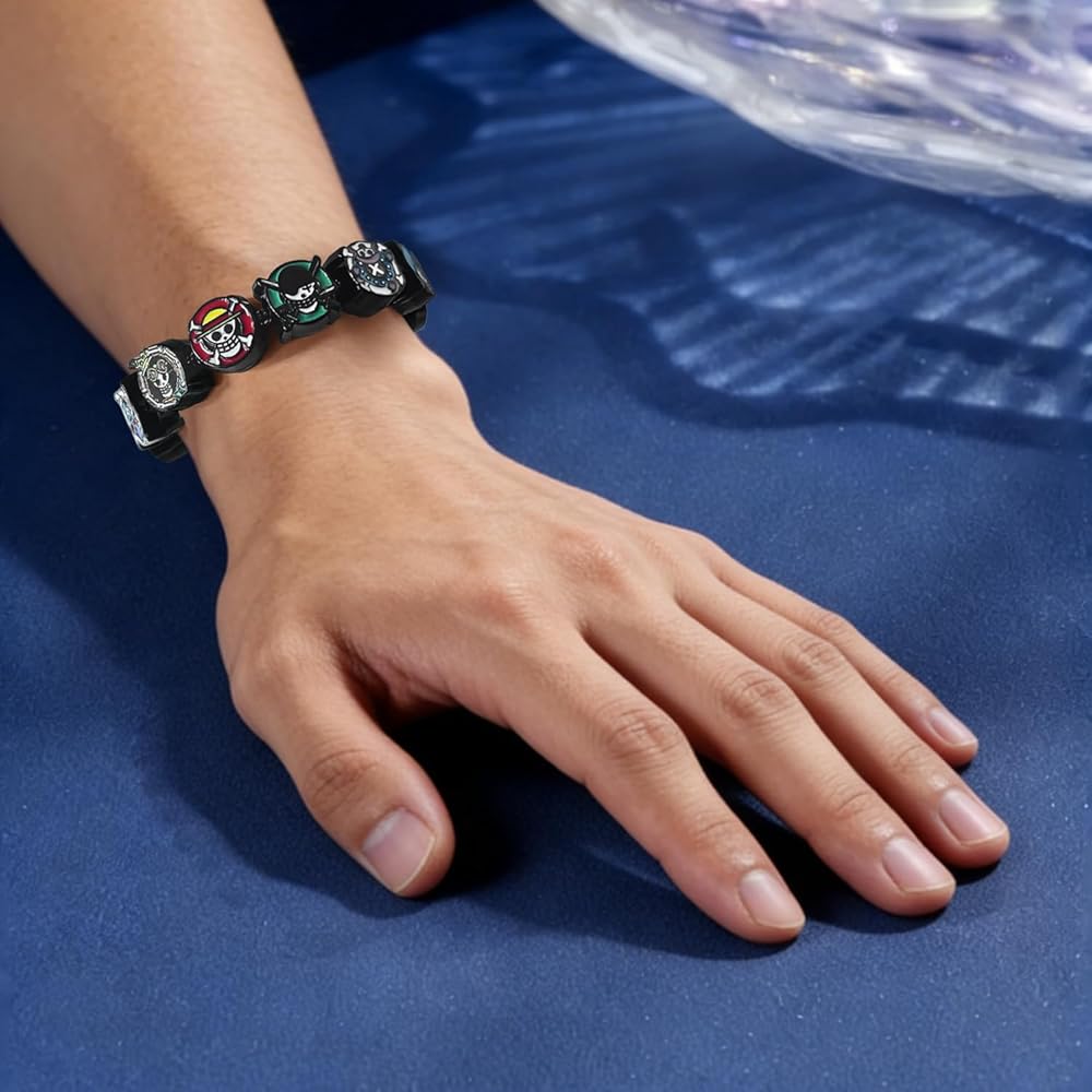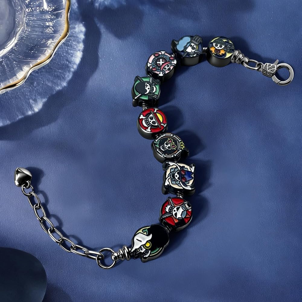 ALCEA ROSEA OP Charm Bracelet Gift Set 9 Anime-Style Mini Chibi Skull Faces, Luffy, Zoro, Nami, Sanji, Usopp, Robin & More, Removable Alloy Chain for Fans (Color Black 1)