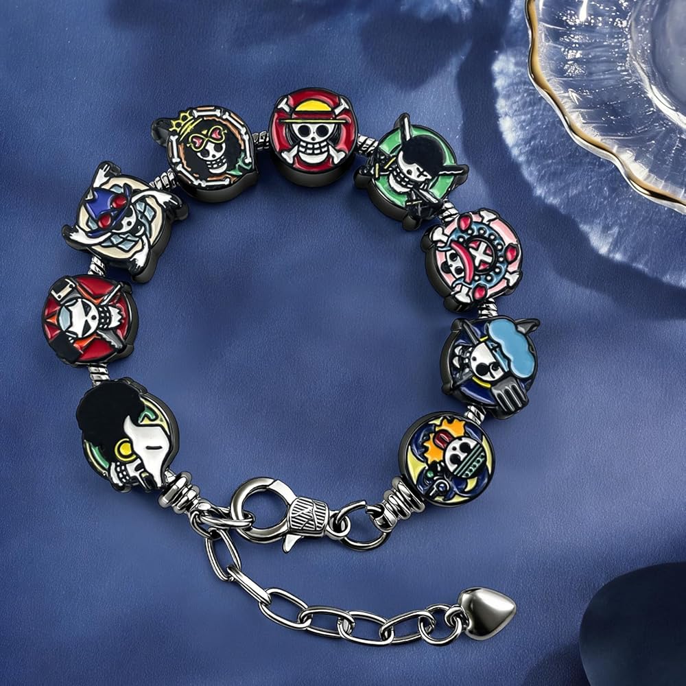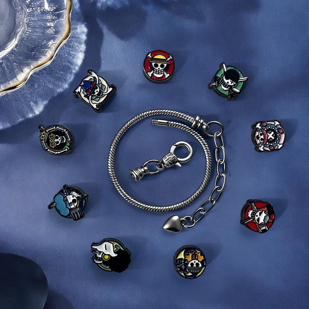 OP Charm Bracelet Gift Set 9 Anime-Style Mini Chibi Skull Faces, Luffy, Zoro, Nami, Sanji, Usopp, Robin & More, Removable Alloy Chain for Fans
