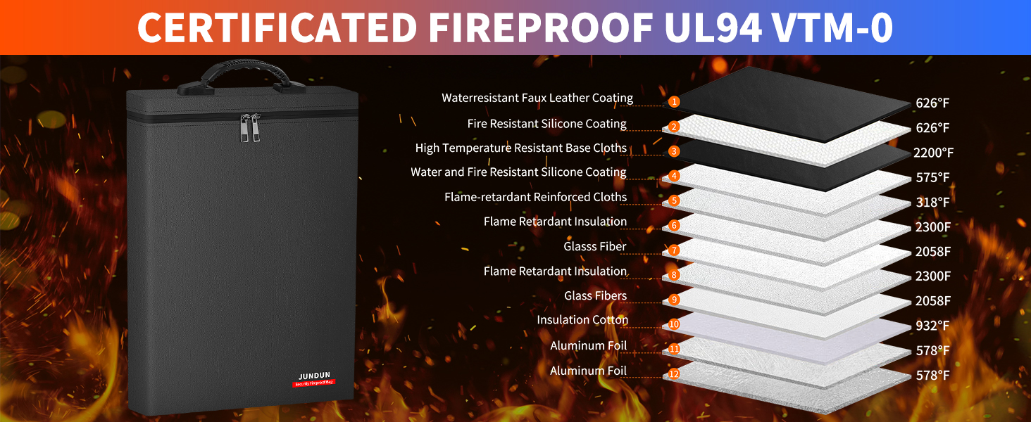 THERMAL INSULATION TECHNOLOGY :Engineered with a 12-layer thermal barrier (fiberglass, foil, thermal cotton), this fireproof document bag withstands 6400°F flames while meeting UL94 VTM-0 standards. The soft-touch exterior offers daily comfort without compromising protection for laptops, contracts, legal documents, or passports. Secure your valuables during commutes, travel, or emergencies—no compromise on safety or style