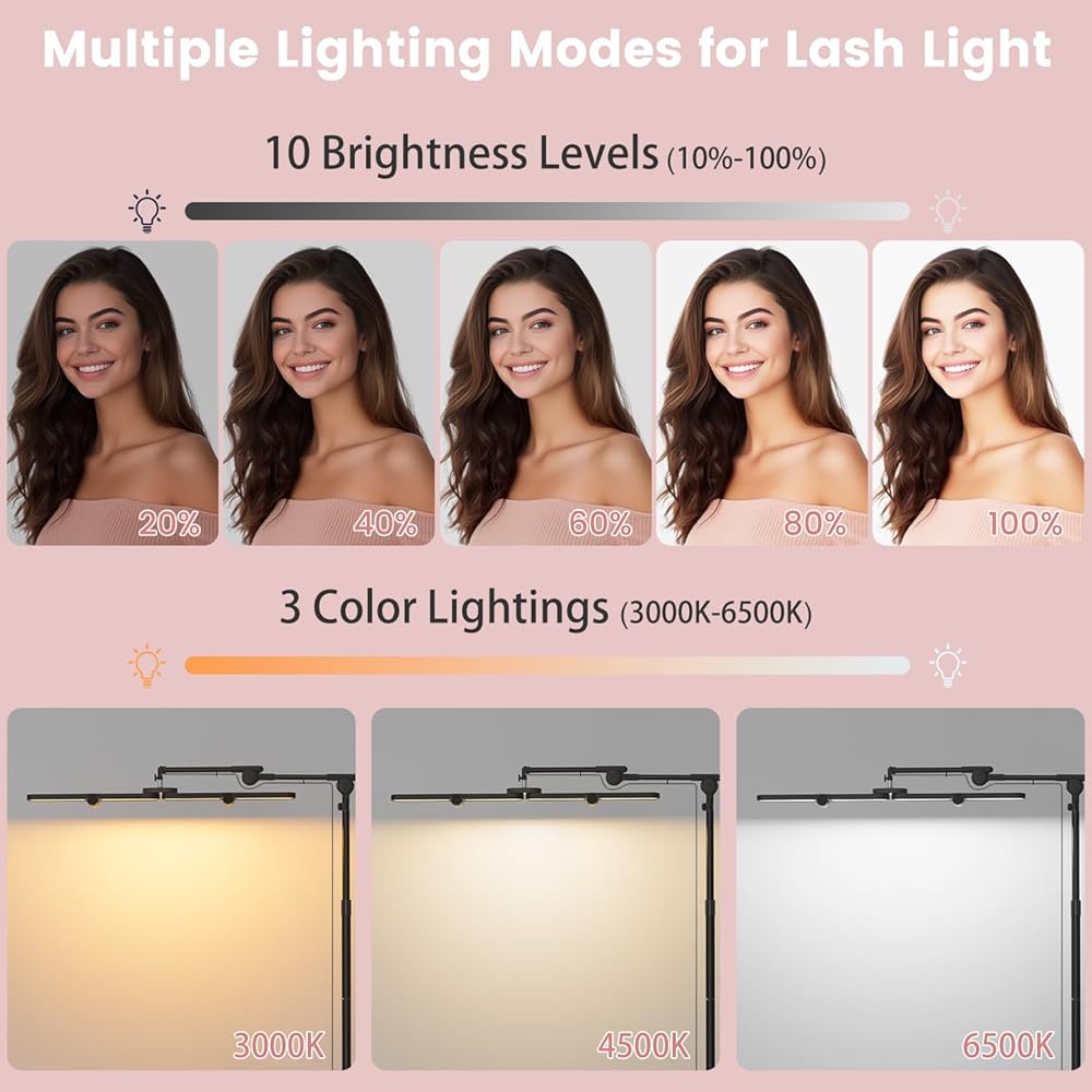 3 Color Modes & 10 Dimming Brightness: 40W LED Lash light features 336 LED beads, delivering up to 4000 lumens. Easily adjust 3 color temperatures (3000K-6500K) and 10 brightness (0%-100%) for custom ways. Perfect for professional Salon use, lashes, esthetician, precision tasks, etc,.