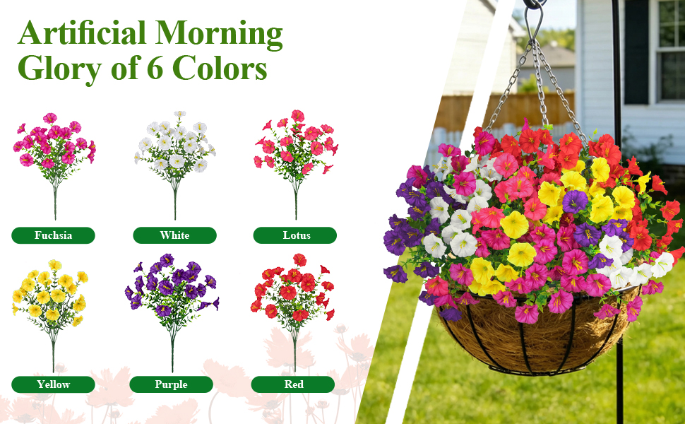 Product Includes: This artificial flowers for outdoors set contains 24 bundles fake flowers morning glory(white, yellow, red, fuchsia, purple, light fuchsia), along with green eucalyptus leaves; The quantity is sufficient for your decoration purposes