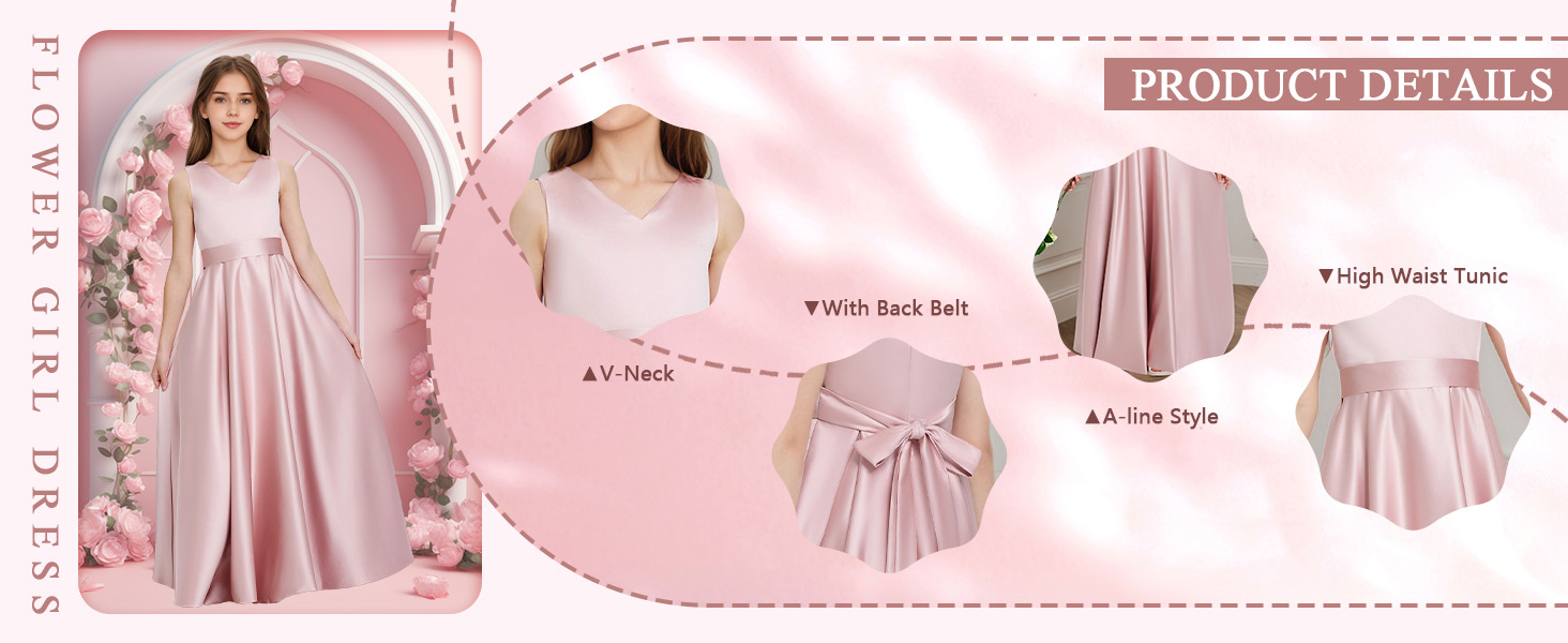 Exquisite Design: A-line Style Pageant Dresses, Satin V-Neck Ball Gown Dress, Long Flower Girl Dress, Sleeveless, High Waist Tunic Dresses, Zipper Closure with belt, Floor-length. Perfect for Toddler girls/ little girls/teen girls/ junior girls.