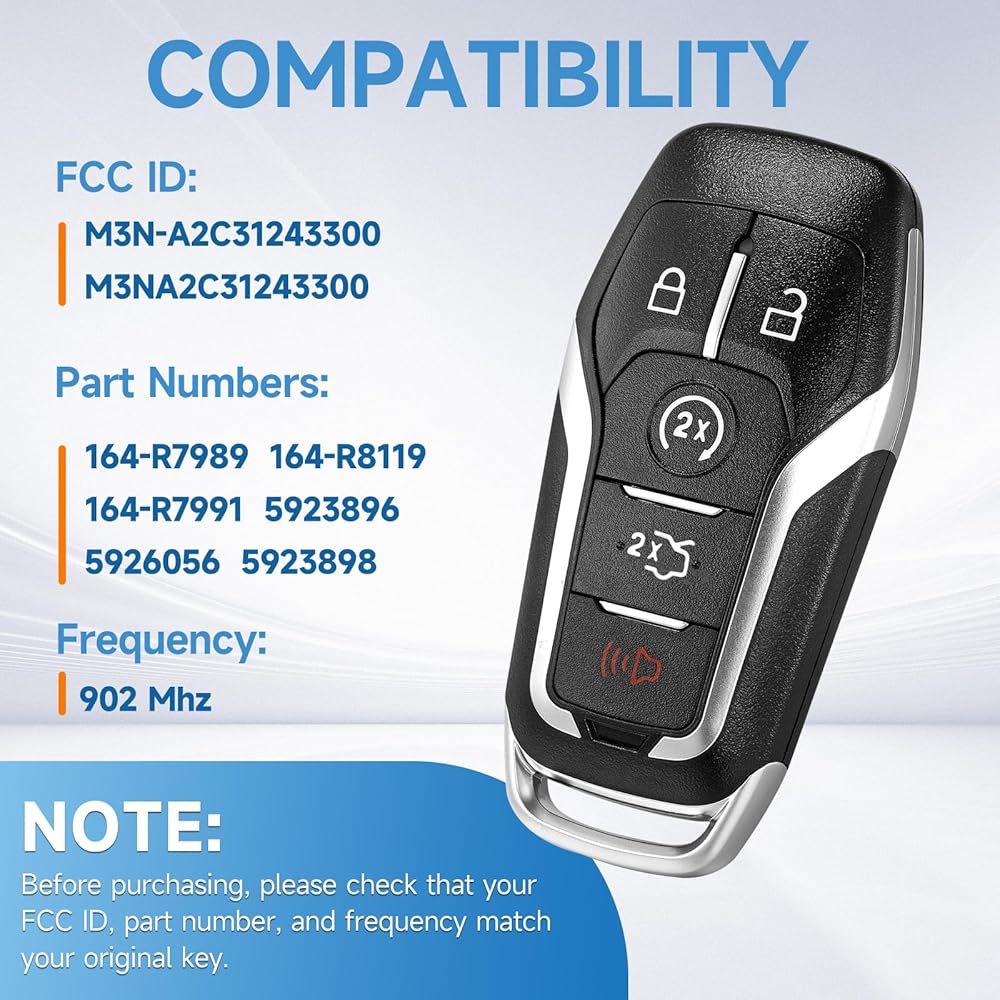 COMPATIBILITY:Compatible with FCC ID:M3N-A2C31243300,M3NA2C31243300,Each key fob replacement comes with batteries and chips,This key fob is compatible with Ford Edge Mustang 2015-2017,Explorer 2016-2017,Fusion 2013-2016,Lincoln MKZ 2013-2016,MKC 2014-2016,MKX-2016-2019