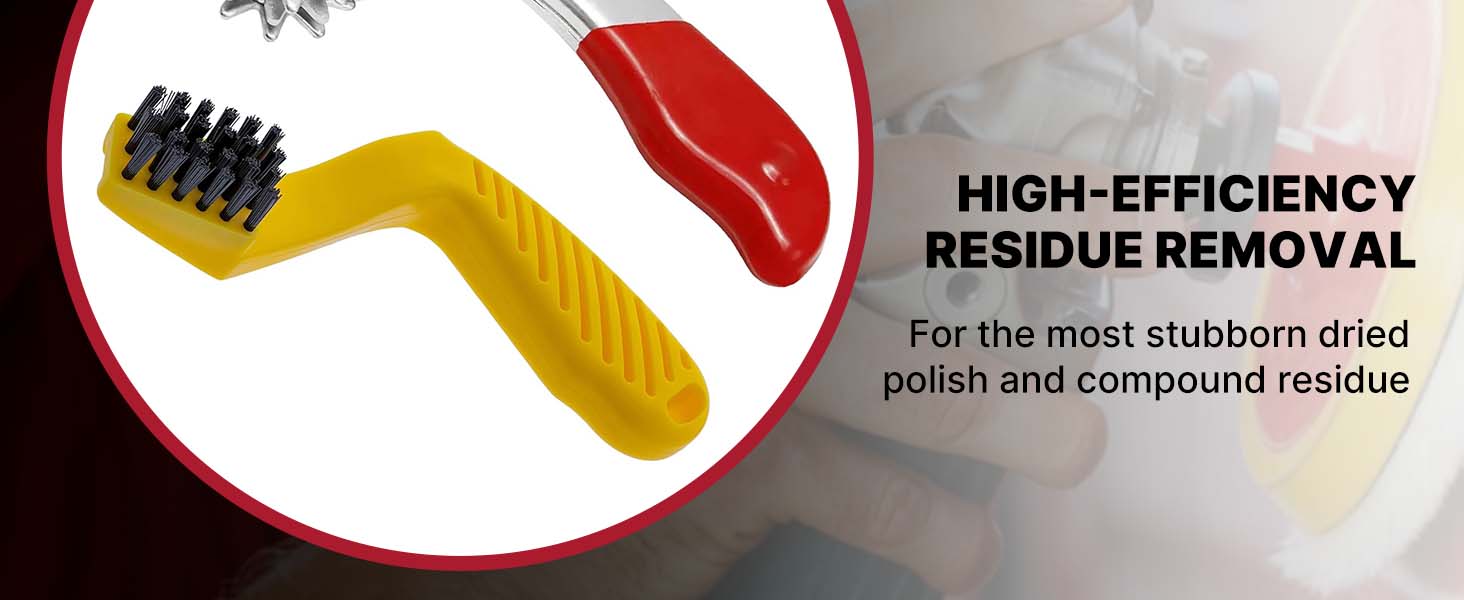 Heavy-Duty Foam Pad Conditioning Brush Tool: Featuring sturdy nylon bristles and an ergonomically angled handle, this brush allows for comfortable use while keeping your hand safely away from the spinning buffer. It's perfect for cleaning foam pads, microfiber pads, and polishing bonnets.