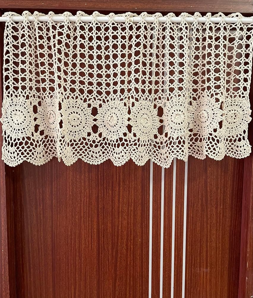 Elegant off-white valance embellished with handmade knitted lace and flower shape design chic feeling clean simple but elegant