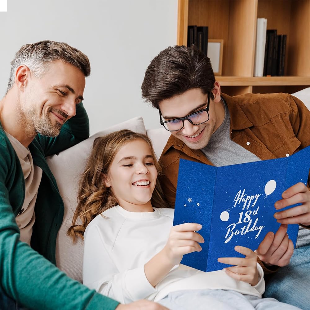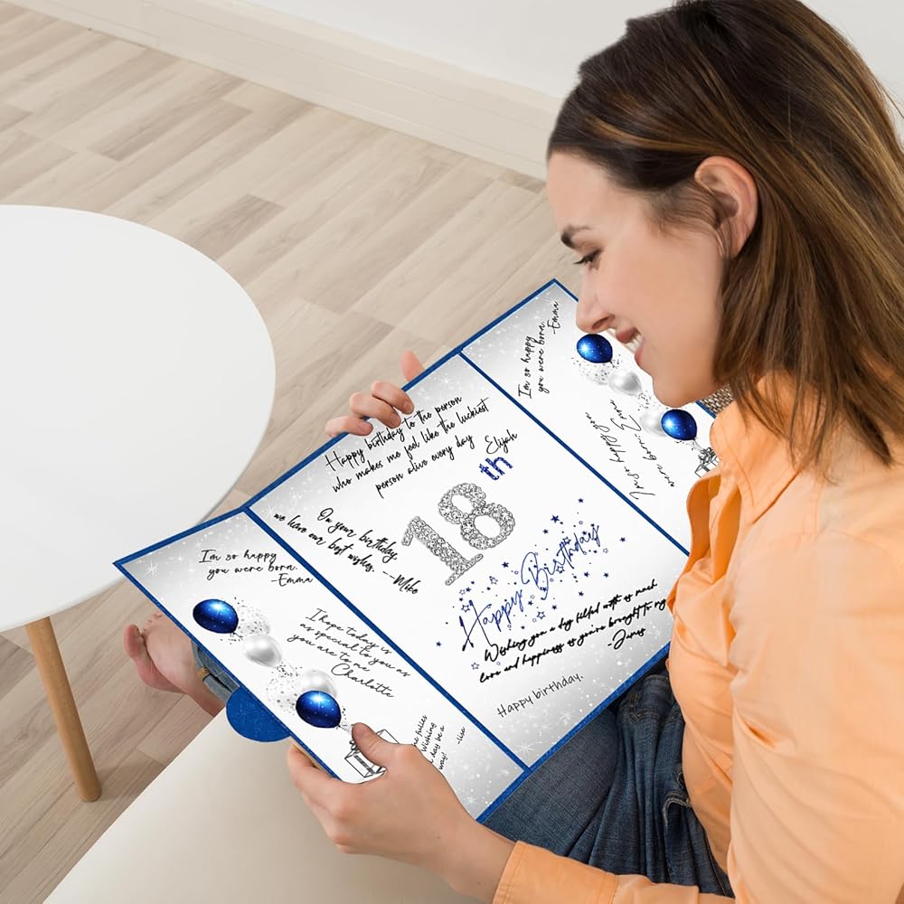 【Exquisite Design】- The blue and silver certificate has a gilded badge on the cover, and the inside of the signature certificate is divided into three parts, the middle page is printed with the message '18th Happy Birthday'. This 18th birthday signature board can be opened directly and stand on the table. Tips: No pen.