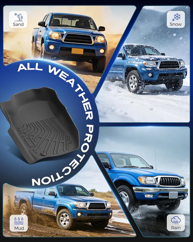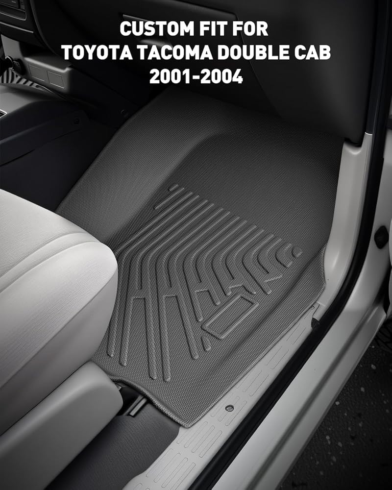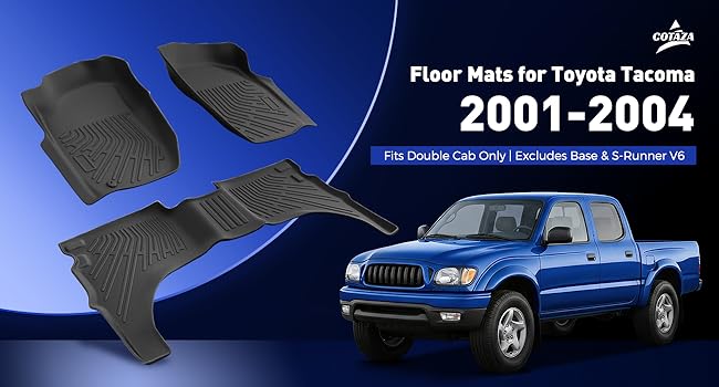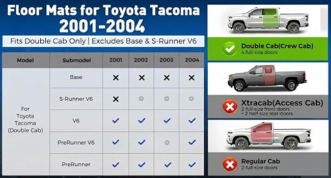 Custom Fit for Toyota Tacoma: Specifically made for Toyota Tacoma 2001–2004 Double Cab models, these heavy-duty floor mats provide full coverage for the front and second rows and blend well with your truck's interior. Not compatible with Regular Cab, XtraCab, or Access Cab. Please verify your vehicle details and cab configuration before ordering. No trimming required