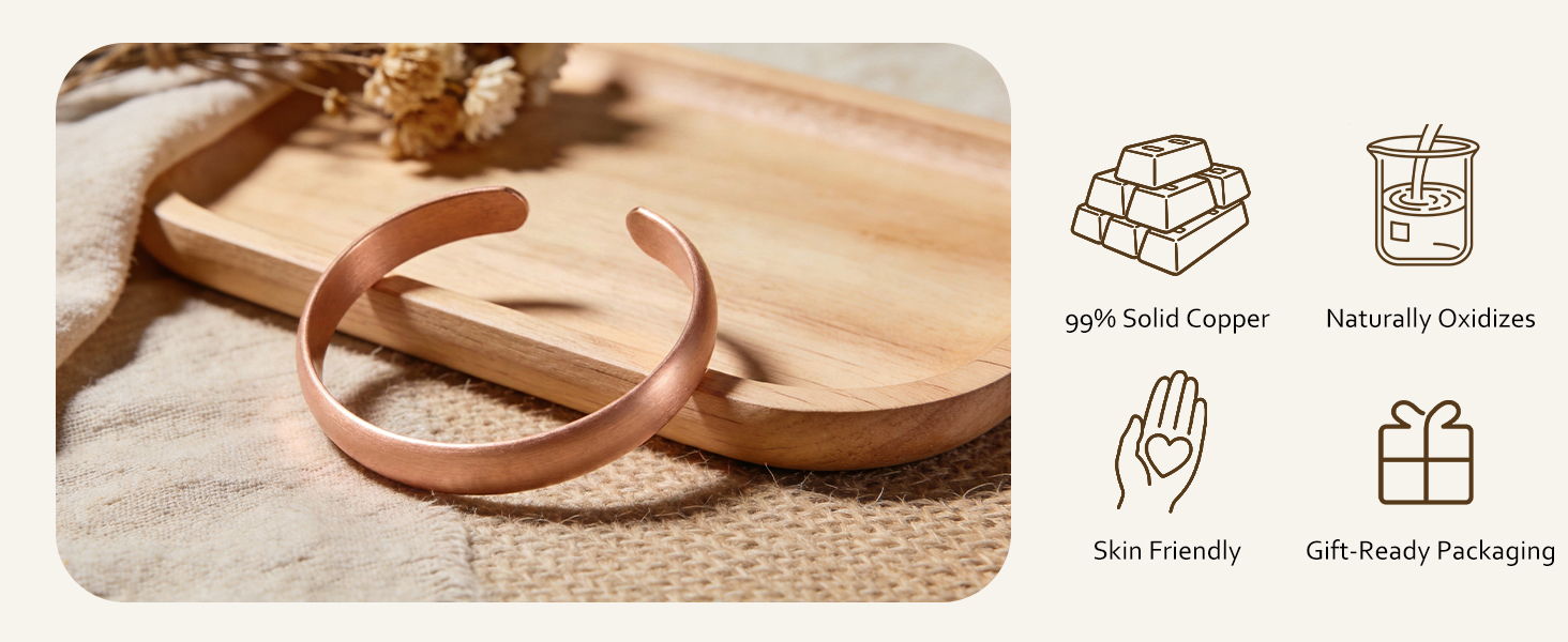 Pure Copper Material — Copper Bracelet made from solid copper, not plated or coated, offering a natural warm tone, substantial weight, and long-lasting durability.