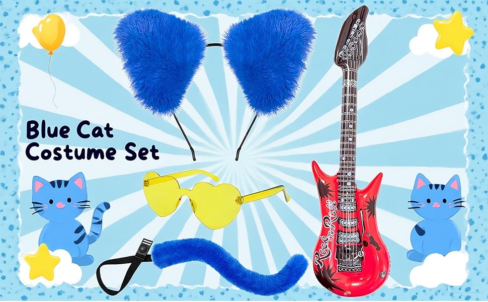 Blue Cat Costume Set: This blue cat set includes 1 fluffy blue cat ear headband and tail, 1 pair of cute cat glasses, 1inflatable red guitar