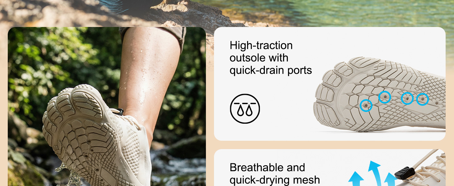 QUICK-DRY DRAINAGE:The specially designed drainage holes on the sole quickly expel water and sweat. Keep your feet dry and comfortable during water activities or in wet conditions, preventing blisters and discomfort caused by moisture