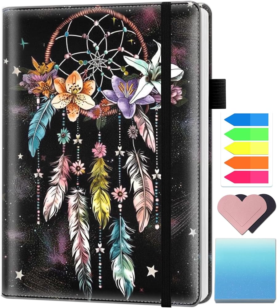 【Hardcover Notebook Set】Contains an A5 Leather Notebook with Beautiful Patterns, Journal Notebook with A Pen Loop and A Bookmark Ribbon, A Elastic Closure Rope, Also We Give You 2 Heart Bookmarks; 5 Color Indexes (100pcs); 50pcs Sticky Notes.