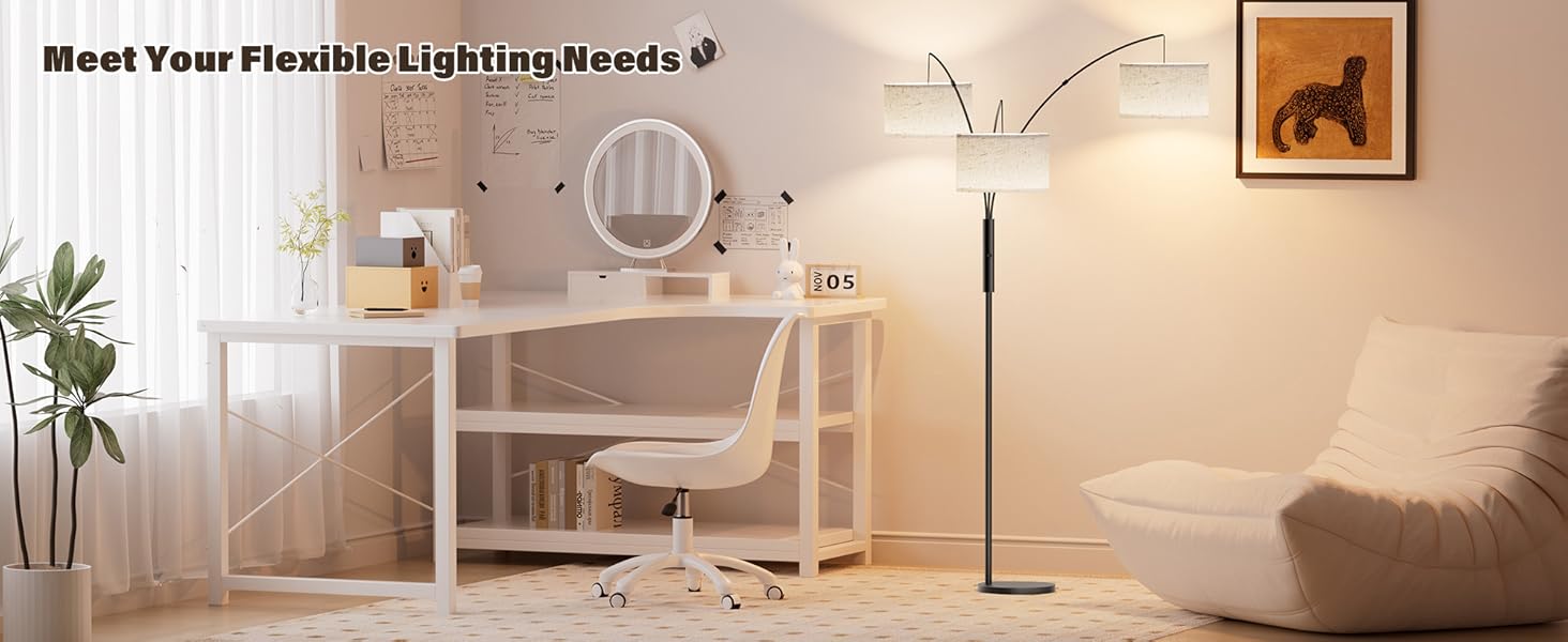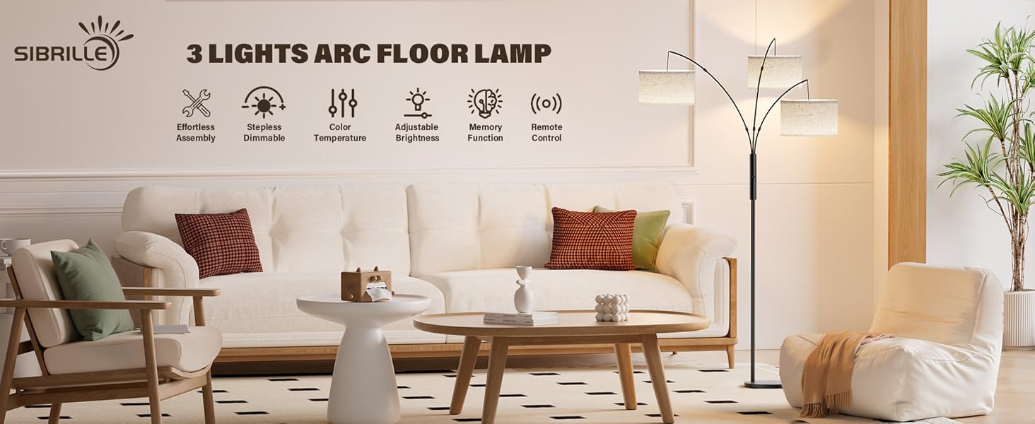 【Practicality Meets Comfort】The non-flashing light source of dimmable floor lamp provides stable and pure lighting, reducing eye fatigue even with prolonged use and protecting the vision of your family. Follow the instructions to assemble it, and you will have it completed within a few minutes. The height of the arched floor lamp in the living room is approximately 73.6 inches, meeting your height requirements. Its 6.9lb base can prevent accidental tipping over and protect the safety of children and pets, so you can use it at home with peace of mind