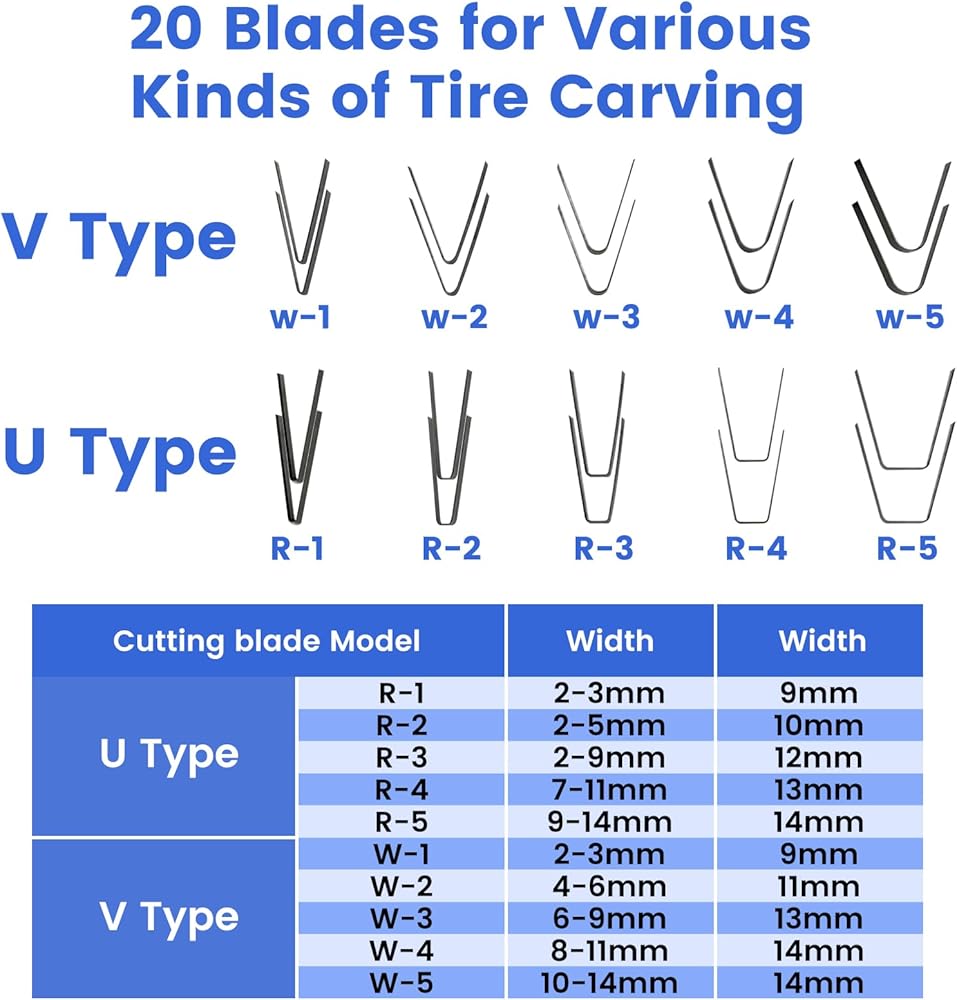 【2 Types of Cutting Blades】Equipped with a total of 20 U-shaped and V-shaped tire cutting blades in multiple widths and depths, enabling engraving of various linear patterns. Engraving width: 2-14mm; depth: 9-14mm, meeting diverse requirements