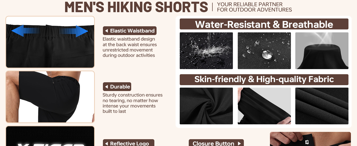 5 Zippered Secure Pockets:Our trail hiking shorts come with 5 practical zippered pockets (2 slant pockets, 2 cargo pockets, 1 back zippered pocket). When hiking, you need to carry many small items like phones, keys, wallets, etc. Perfect as fishing shorts for men, work cargo shorts, hiking shorts or tactical cargo shorts for outdoor activities.