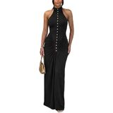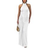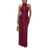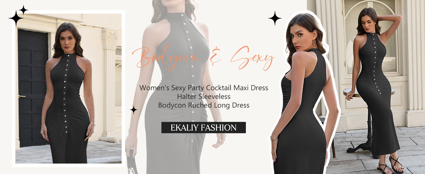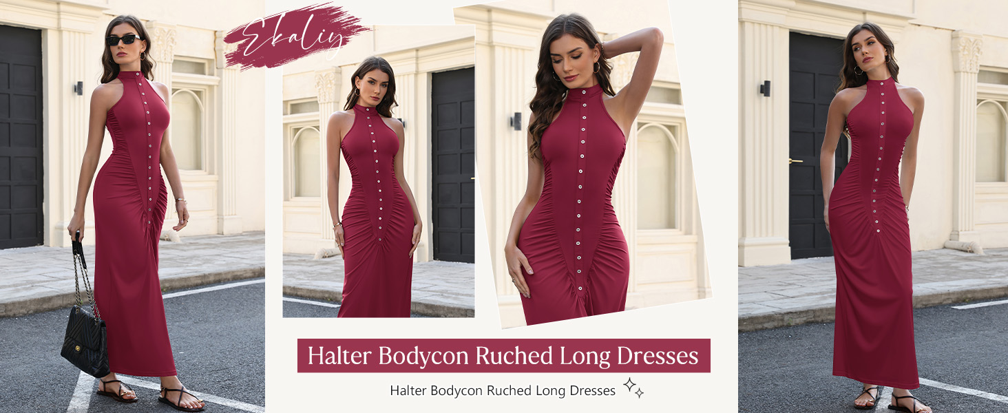 {Feature}: The halter maxi dress is complete with ruched, front button decoration and back zipper detailing, sleeveless halter neckline, bodycon ruched long dress, sexy party evening dress, sexy party cocktail dress gives you a fashion look in this summer and fall.