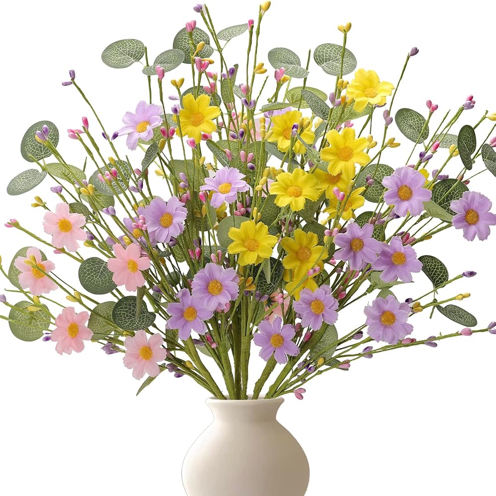 Artificial Spring Flowers with Green Eucalyptus Leaves 6 Pack Spring Floral Picks 17 Inch Eucalyptus Stems with Pink Purple Yellow Daisies for Springtime Summer Easter Decor