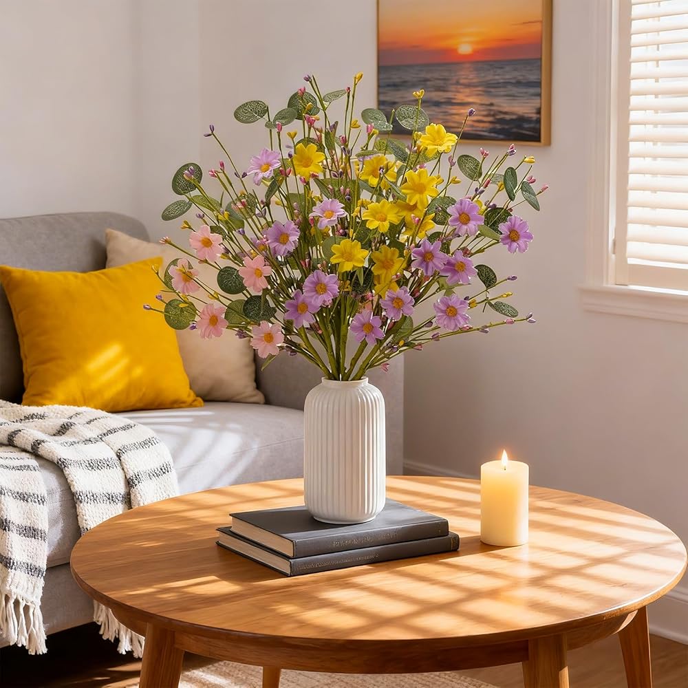 LIFELIKE & TEXTURED DETAILS: These artificial daisies feature soft-to-the-touch silk fabric petals. Each stem is accented with lifelike eucalyptus leaves featuring intricate vein detailing and coordinating pink, purple, and yellow berries, offering a realistic and thick, full-bodied look.