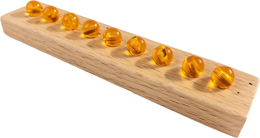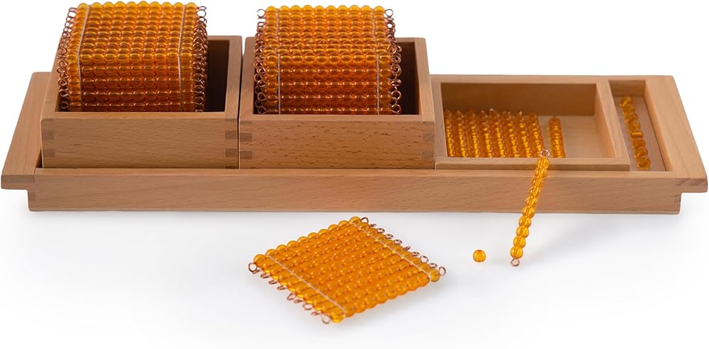 Build the Foundation for All Mathematics: The Professional Decimal System Working Set Where Concrete Experience Meets Mathematical Abstraction Dr.Maria Montessori designed the Golden Beads to be the “key” that unlocks the child's mind to our base-ten number system. Our Premium Decimal System Set with Trays is that key material realized in its most complete and functional form. It allows children aged 4-7+ to physically hold and manipulate the decimal system, transforming the abstract concepts of place value, carrying, and borrowing into tangible, unforgettable experiences. Why This Set is the Professional Choice for Deep Learning: · Pedagogically Complete: It provides the exact quantities needed for comprehensive work, allowing children to independently verify their calculations (e.g., if they run out of units during an addition, they know an exchange is required). · An Exercise in Order & Logic: The solid beechwood tray system is not mere storage; it is an integral part of the lesson. Organizing units, tens, hundreds, and thousands in their designated spaces reinforces the hierarchical structure of the decimal system itself. · Quality That Commands Respect: The substantial main tray (41 cm long), smooth finishes, and precisely crafted beads create a material that children handle with care, fostering respect for their work and environment. Your Complete Professional Set Includes: · Golden Bead Quantities: 10 individual unit beads, 10 ten-bead bars, 10 hundred-bead squares, 1 thousand-bead cube. · Beechwood Tray System: 1 main tray with compartments, 3 removable inner boxes for tens/hundreds/thousands, 1 grooved strip for units. Five Key Educational Objectives Achieved: 1. Master Place Value to 9,999: Develop a concrete, physical understanding that the position of a digit determines its value (ones, tens, hundreds, thousands). 2. Perform Dynamic Addition & Subtraction: Execute mathematical operations that require exchanges between categories (e.g., trading 10 units for 1 ten), understanding the “why” behind arithmetic algorithms. 3. Develop Advanced Problem-Solving & Logical Reasoning: Engage in multi-step processes and discover mathematical patterns through independent experimentation. 4. Cultivate Extreme Concentration & Order: The complex, self-paced work demands and develops deep focus, while the material's design inherently teaches systematic thinking. 5. Build Unshakeable Mathematical Confidence: Successfully working with large numbers and complex operations instills a sense of mastery and a positive “I can do math” identity. Technical Specifications & Safety: · Materials: Acrylic Golden Beads, Solid Beechwood Trays. · Main Tray Dimensions: 41 x 14 x 8 cm / 16.1" x 5.5" x 3.1". · Total Package Weight: ~1.5 kg. · Age Recommendation: 4-7+ years (under adult supervision). · Compliance: Made with non-toxic, child-safe materials meeting applicable international safety standards. The Ideal Resource for: · Montessori Schools: The central material for the 3-6 and 6-9 math curriculum. · Homeschooling Families: A complete, professional-grade homeschool math lab that makes advanced concepts clear. · Kindergarten & Early Elementary Teachers: A powerful math manipulative for demonstrating place value and operations in a group setting. · Special Needs Educators: An exceptional autism-friendly math tool due to its concrete, visual, and structured nature. Highly beneficial in occupational therapy for fine motor skills and sequential processing. · Cognitive Care for Seniors: As a cognitive therapy tool, it provides meaningful, multi-step activities for adults with dementia, aiding memory, logical sequencing, and sensory engagement.