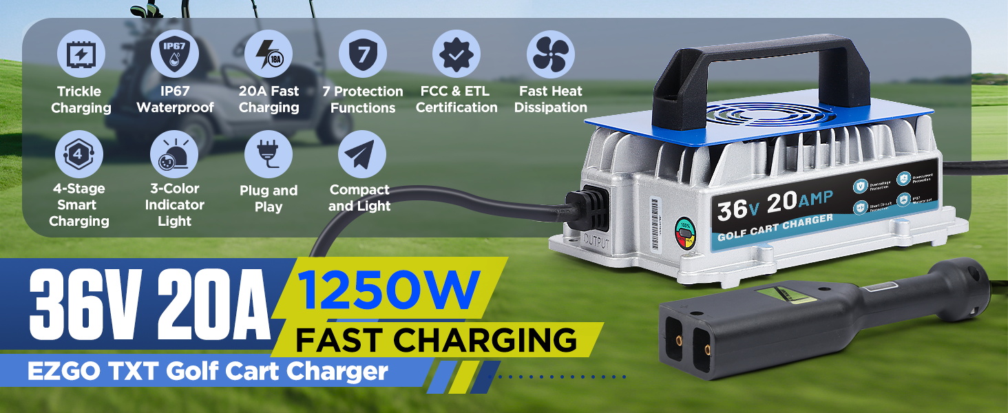 20 AMP 36 Volt Golf Cart Charger for EZGO TXT, IP67 Waterproof & Trickle Charge, 1250W Fast 36 Volt EZGO Golf Cart Battery Charger Full Auto Charge with D-Style Plug, 16FT Cable, for Lead-Acid Battery