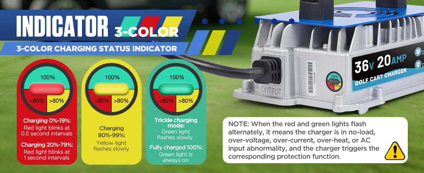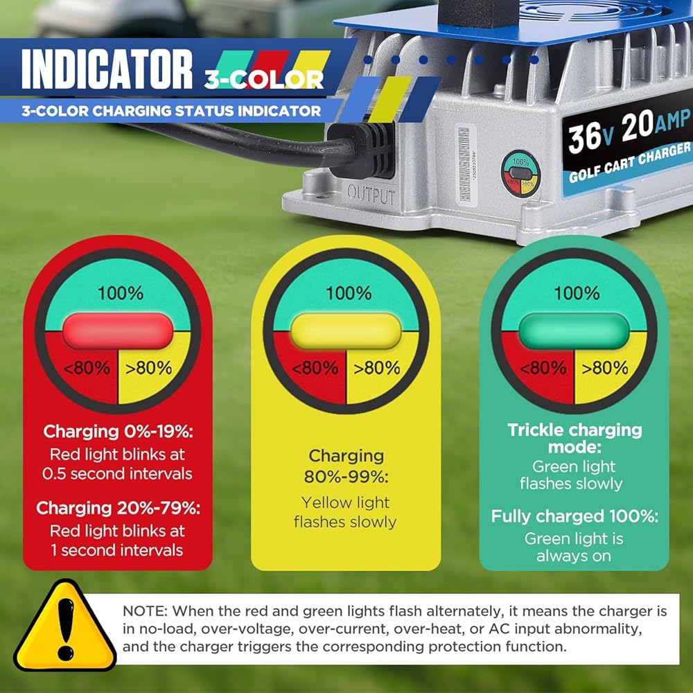 【3-Color Charging Indicator & Wide Operating Range】This 36 volt ezgo charger features a 3-color charging status indicator for clear charging progress visibility: 0~19% (Red Light Fast Flash), 20~79% (Red Light Slow Flash), 80~99% (Yellow Light Flash), approximately 100% (Green Light Flash), and 100% fully charged (Steady Green Light ), with a wide operating temperature range (-22°F to 149°F) to ensure reliable performance in extreme weather conditions, so you don't need to worry about weather-related charging problems.
