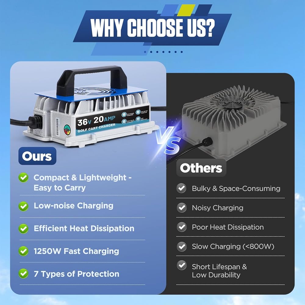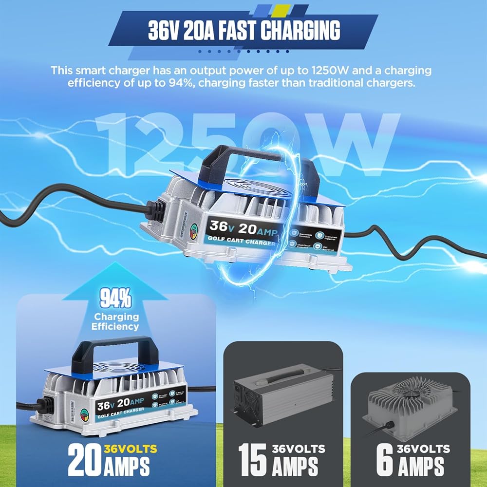 【20A Rapid Charge & 94% Charging Efficiency】This ezgo charger is specifically designed for 36V EZGO TXT golf carts with Powerwise "D" plug. With 20A 1250W high power output, it significantly reduces charging time and quickly restores power to your golf cart. Featuring 94% high charging efficiency, it remarkably minimizes energy loss during charging. Compared to traditional 6A chargers, our ezgo battery charger delivers faster charging speed and higher efficiency. Suitable for lead-acid batteries.